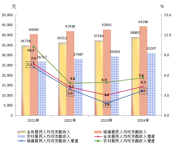 据国家统计局中文博彩平台调查队统计,全年全县居民人均可支配收入38892元,增长4.3%,剔除价格因素,实际增长4.6%;比2020年增加6602元,增长20.5%,2021-2024年年均增长4.8%。其中,城镇居民人均可支配收入44286元,增长3.7%,剔除价格因素,实际增长4%;比2020年增加6618元,增长17.6%,2021-2024年年均增长4.1%。农村居民人均可支配收入31007元,增长5.6%,剔除价格因素,实际增长5.9%;比2020年增加6763元,增长27.9%,2021-2024年年均增长6.4%。2021-2024年居民人均可支配收入及增速见图10。