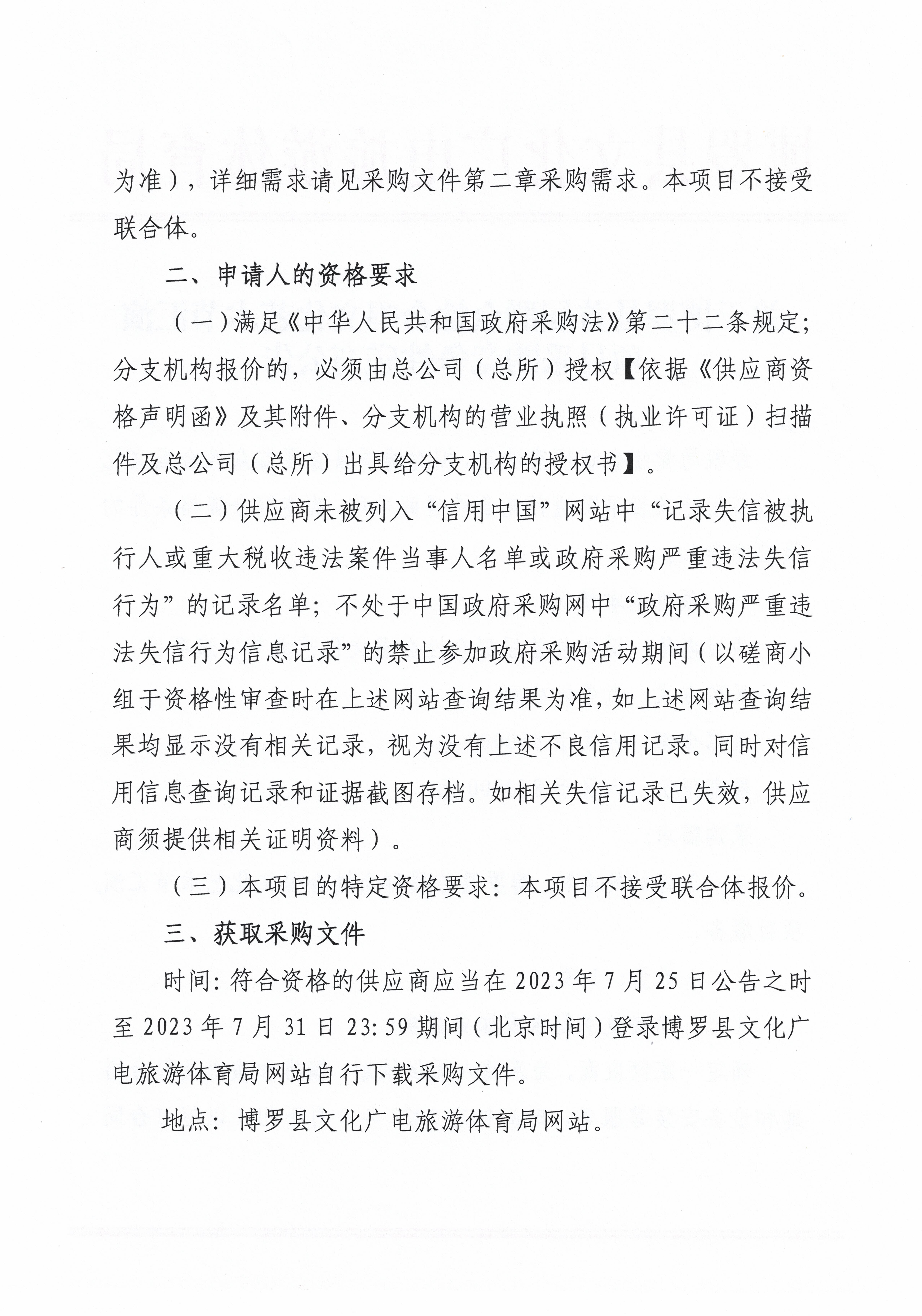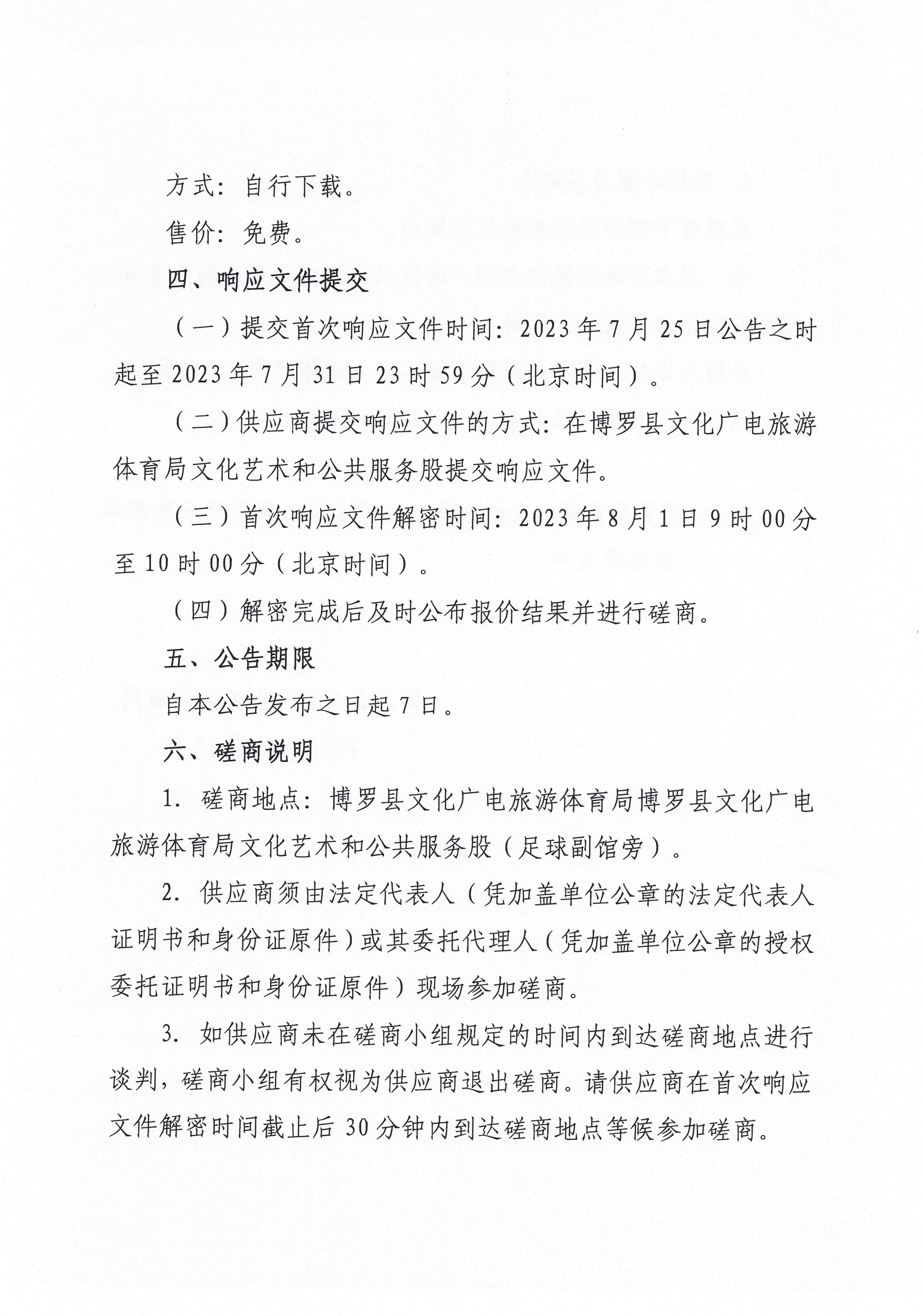 三、获取采购文件时间:符合资格的供应商应当在2023年7月25日公告之时至2023年7月31日23:59期间(北京时间)登录中文博彩平台文化广电旅游体育局网站自行下载采购文件。