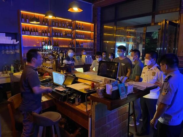 6月4日晚,由县市场监督管理局、县公安局、县文化广电旅游体育局、县卫生健康局、县消防大队工作人员组成的密闭性酒吧疫情防控工作专班,对罗阳街道酒吧进行检查,重点排查场所出入管理、健康监测、严格落实佩戴口罩、测量体温、查验健康码、食品卫生、消防安全等工作,严控密闭性酒吧场所接纳消费者人数不超过核定人数的75%及50人以上聚集性餐饮活动。