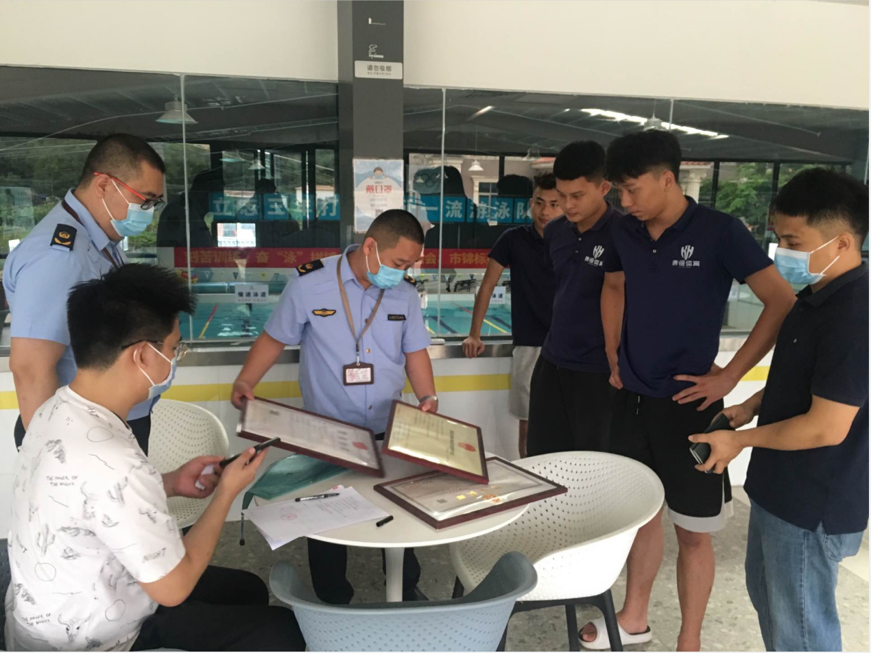 6月22日,市场管理股工作人员前往罗阳街道,对2家游泳池申请《高危险性体育项目经营许可证》进行场地审核。