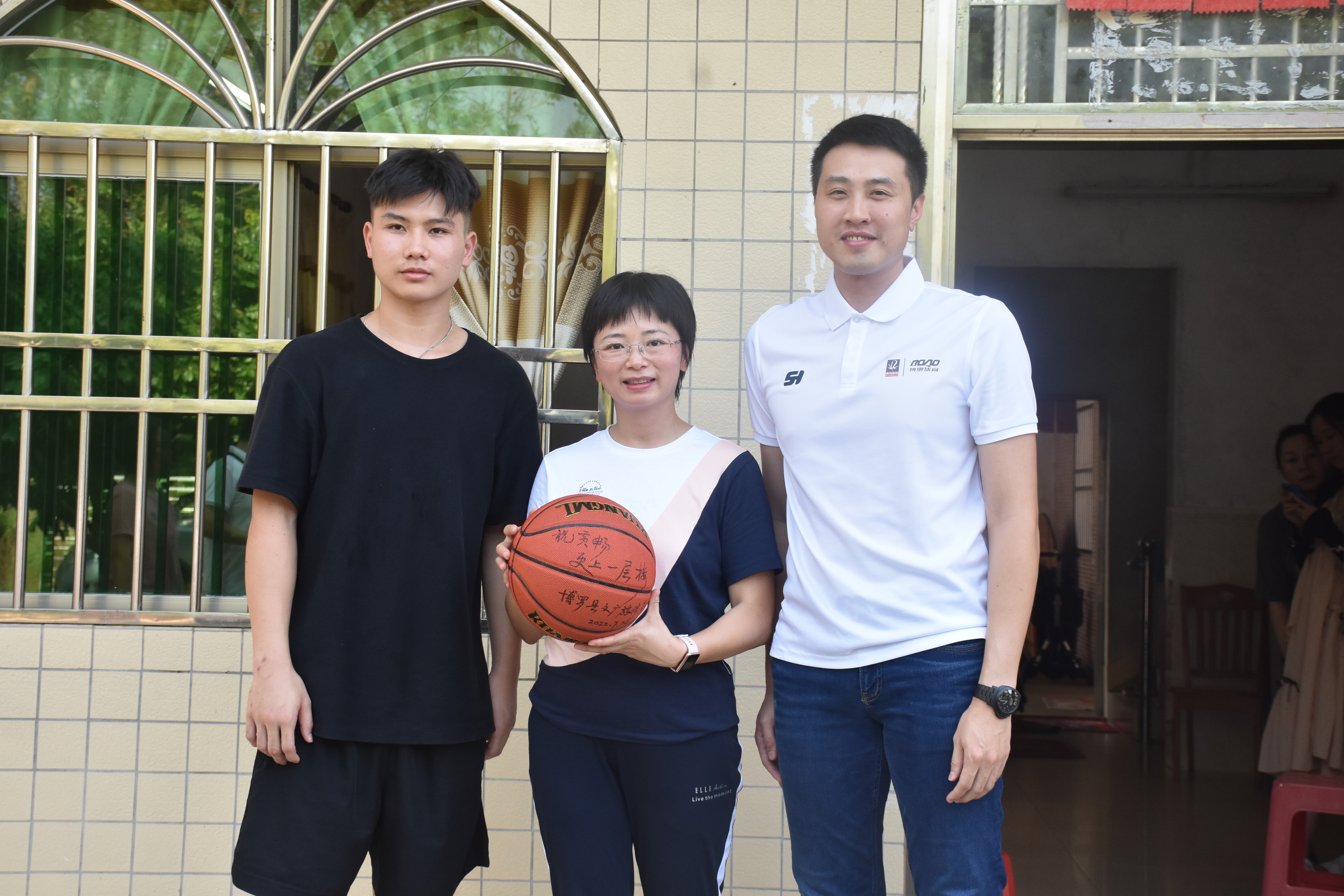 中文博彩平台文化广电旅游体育局陈雪花局长对黄畅入选CBA球员表示祝贺,并赠送今年广东省第十六届运动会篮球比赛专用球,图为黄畅、惠州市篮球协会会长周杰一同合影