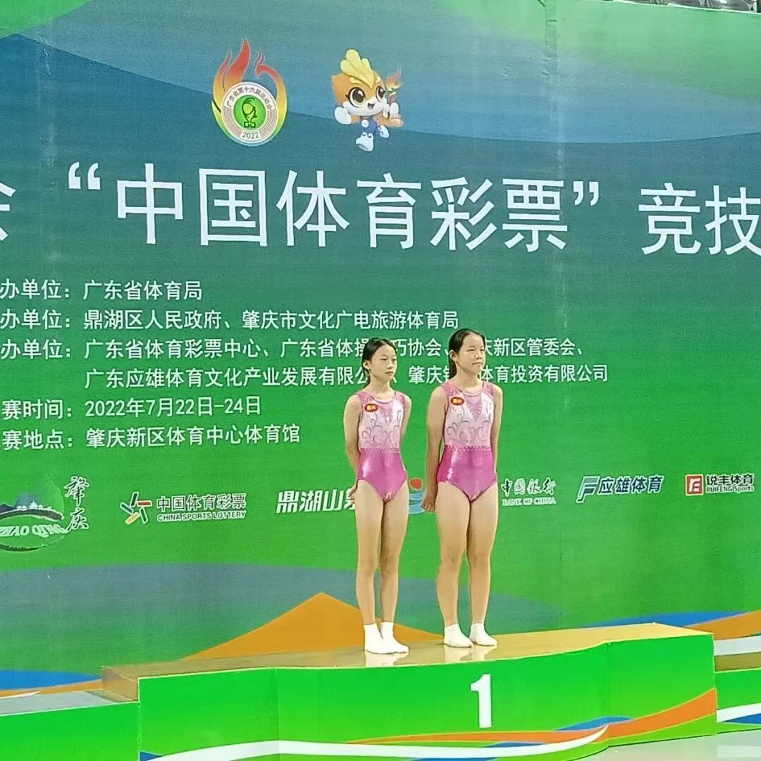 7月24日,广东省第十六届运动会竞技组蹦床项目,我县籍运动员赖卓琳(左一)荣获女子乙组双人同步比赛冠军