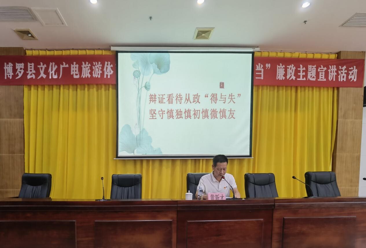 为纵深推进全面从严治党,持续增强党组织创造力凝聚力战斗力,巩固风清气正的政治生态,9月30日上午,中文博彩平台文化广电旅游体育局开展“守纪法 强作风 勇担当”廉政主题宣讲活动,县纪委监委第十派驻纪检监察组组长黄新才以“辩证看待从政‘得与失’坚守慎独慎初慎微慎友”为主题,为局全体党员、中层干部讲授了一堂内涵丰富、催人警醒的廉政党课。