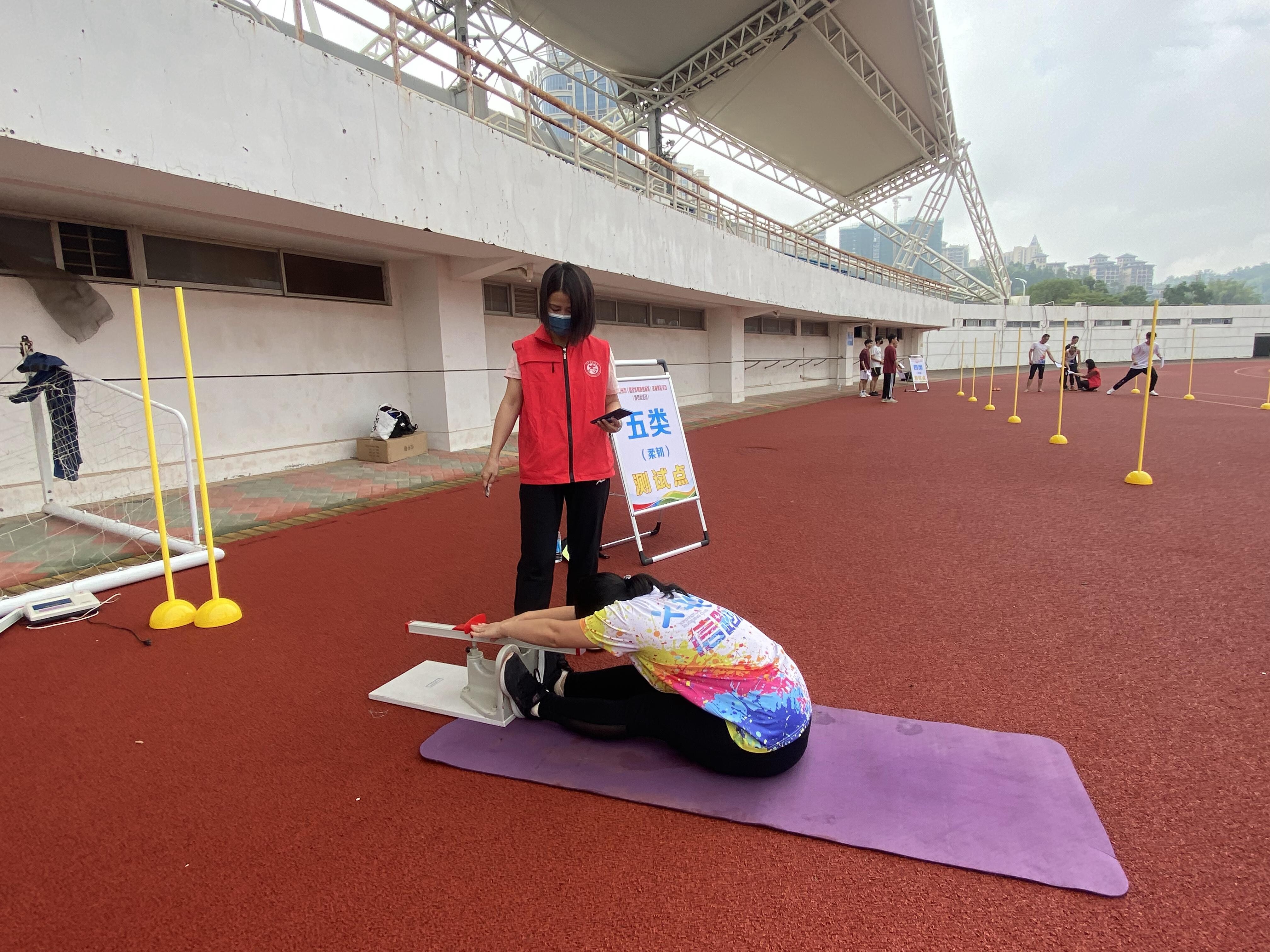 本次测验活动按参与人员年龄的不同,分为青年组(18-24岁)、壮年组(25-59岁)及老年组(60-69岁)3个组别,开展了速度(跳绳)、柔韧(坐位体前屈)、耐力(长距离跑)、灵敏(绕杆跑、曲线托球跑)和力量(立定跳远、一分钟仰卧举腿、掷实心球)五类项目测验。