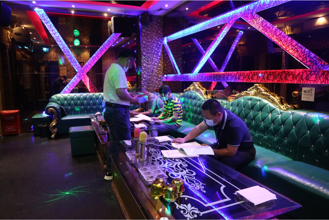 4月13日,市场管理股工作人员前往泰美镇、罗阳街道,分别对2家KTV场所申请延续进行场地审核。