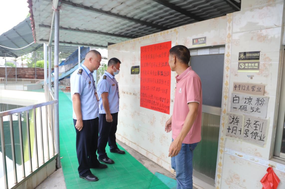 6月15日,我局党组成员李卫明率执法大队前往麻陂镇,联合当地党群综合服务中心,开展文旅体市场检查工作,对辖区内两家游泳池发出责令改正通知书,并责令其停止经营高危体育项目。