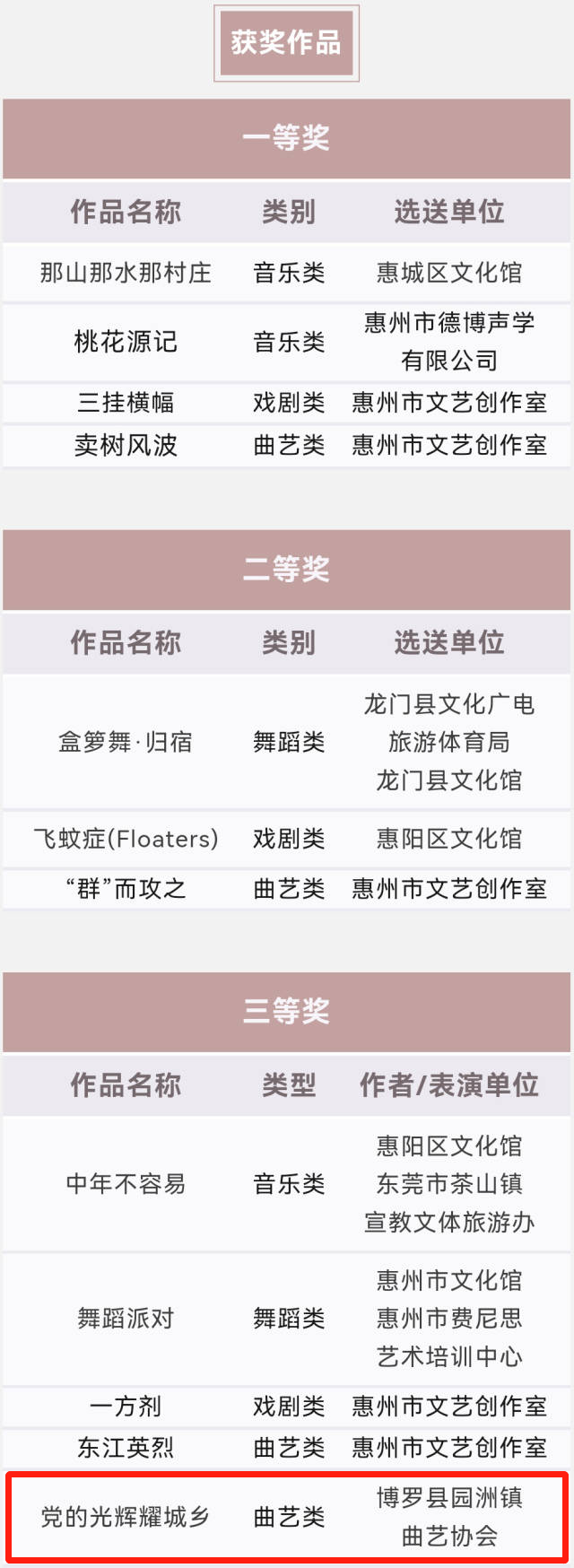 据了解,广东省群众文艺作品评选工作是由广东省文化和旅游厅组织开展,面向全省群众文艺作品,为广东省群众文艺作品评选类最高等级赛事,每年举办一次。今年评选共收到音乐、舞蹈、戏剧、曲艺作品550件,评出获奖作品211件,其中一等奖41件、二等奖68件、三等奖102件。由中文博彩平台园洲镇曲艺协会创作的《党的光辉耀城乡》荣获三等奖。