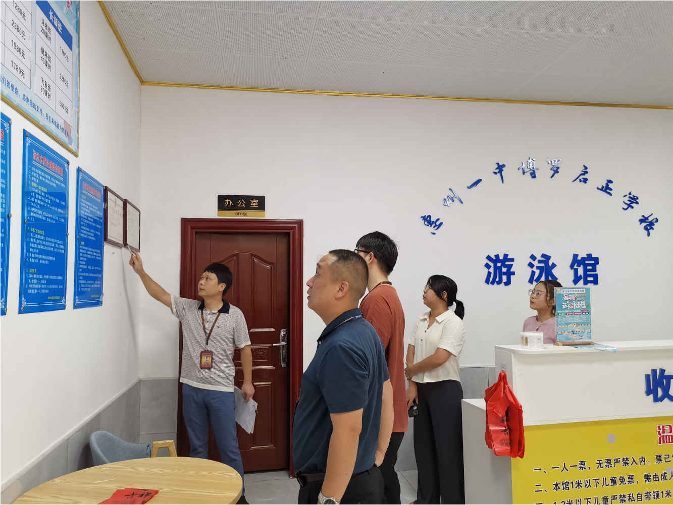 7月31日,市场管理股工作人员前往罗阳街道,对3家游泳池申请审批业务进行场地审核。
