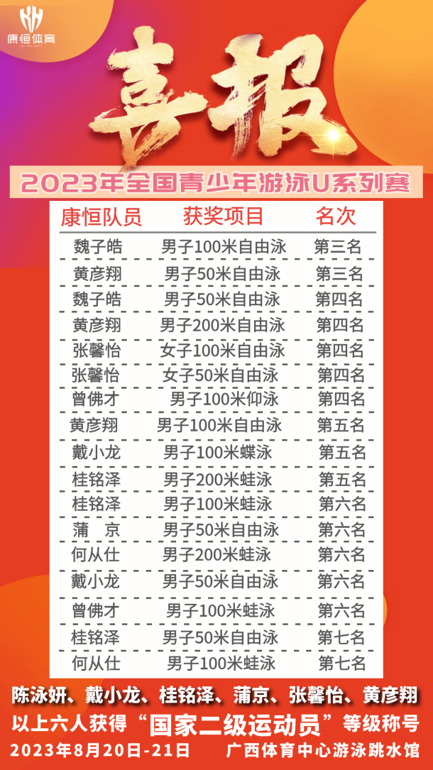此外,我县队员陈泳妍、戴小龙、桂铭泽、蒲京、张馨怡、黄彦翔等六人在该项赛事中获得“国家二级运动员”等级称号。这是我县自2022年创建游泳后备人才合作共建基地以来,首次在全国性游泳比赛崭露头角,在系列阶段比赛中表现优异。这些队员连续两年参加惠州市青少年游泳锦标赛、广东省青少年游泳锦标赛、广东省青少年游泳U系列赛等比赛,经过历次比赛的打磨,成绩越来越好,期待他们向更高竞技水平迈进!
