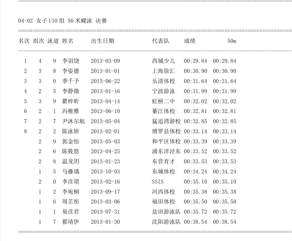 8月22-23日,来自全国187个参加单位752名运动员晋级U系列总决赛,参赛选手均为深圳市、重庆市和滁州市举行的三站资格赛和U系列比赛中的佼佼者,可谓“强手如林、精英荟萃”,争夺异常激烈!晋级总决赛前八名的队员大部分达到国家一级运动员水平。最终,U10组别的队员陈泳妍50米蝶泳获得该项目比赛全国第八名、100米蝶获第九名,叶澍50米蝶泳获得第十名。