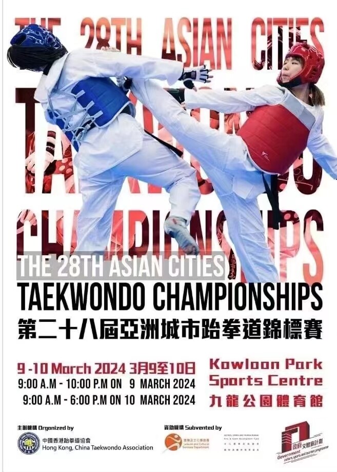 2024年3月9-10日,第二十八届亚洲城市跆拳道锦标赛在香港九龙举办,吸引了来自中国香港、中国澳门、中国台湾、蒙古国、马来西亚、尼泊尔等地共43支队伍参加。