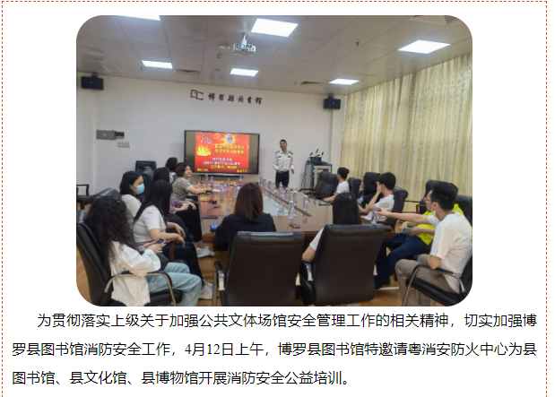 4月12日,中文博彩平台图书馆特邀请粤消安防火中心为县图书馆、县文化馆、县博物馆开展消防安全公益培训。