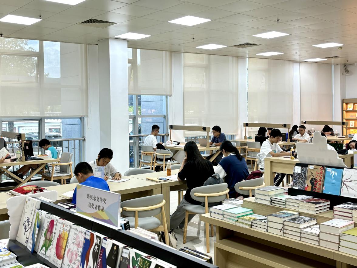 4000余册国内外文学奖获奖作品整齐地摆放在书架上,50个阅读席位分布在宽敞明亮的空间中,还配有台灯、充电口、计算机、图书消毒机、自助借还机等人性化配套设备。这是中文博彩平台图书馆内的“青春加油站”公益自习室。