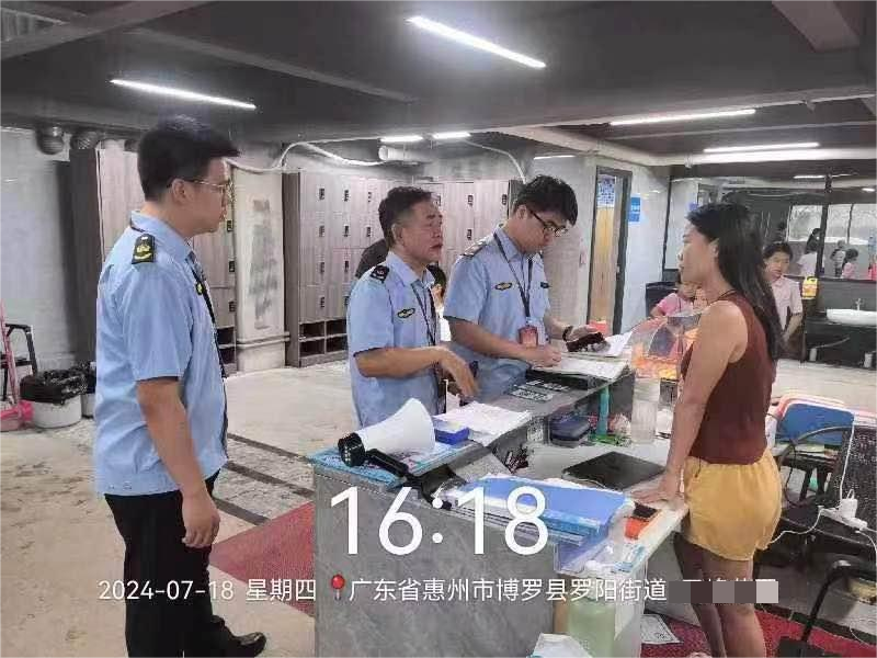 7月15日,执法大队工作人员前往罗阳街道,核实1宗高危险性体育项目经营活动场所(游泳池)投诉。执法人员检查发现此场所相关证照不完善,现场责令业主立即停止经营行为。