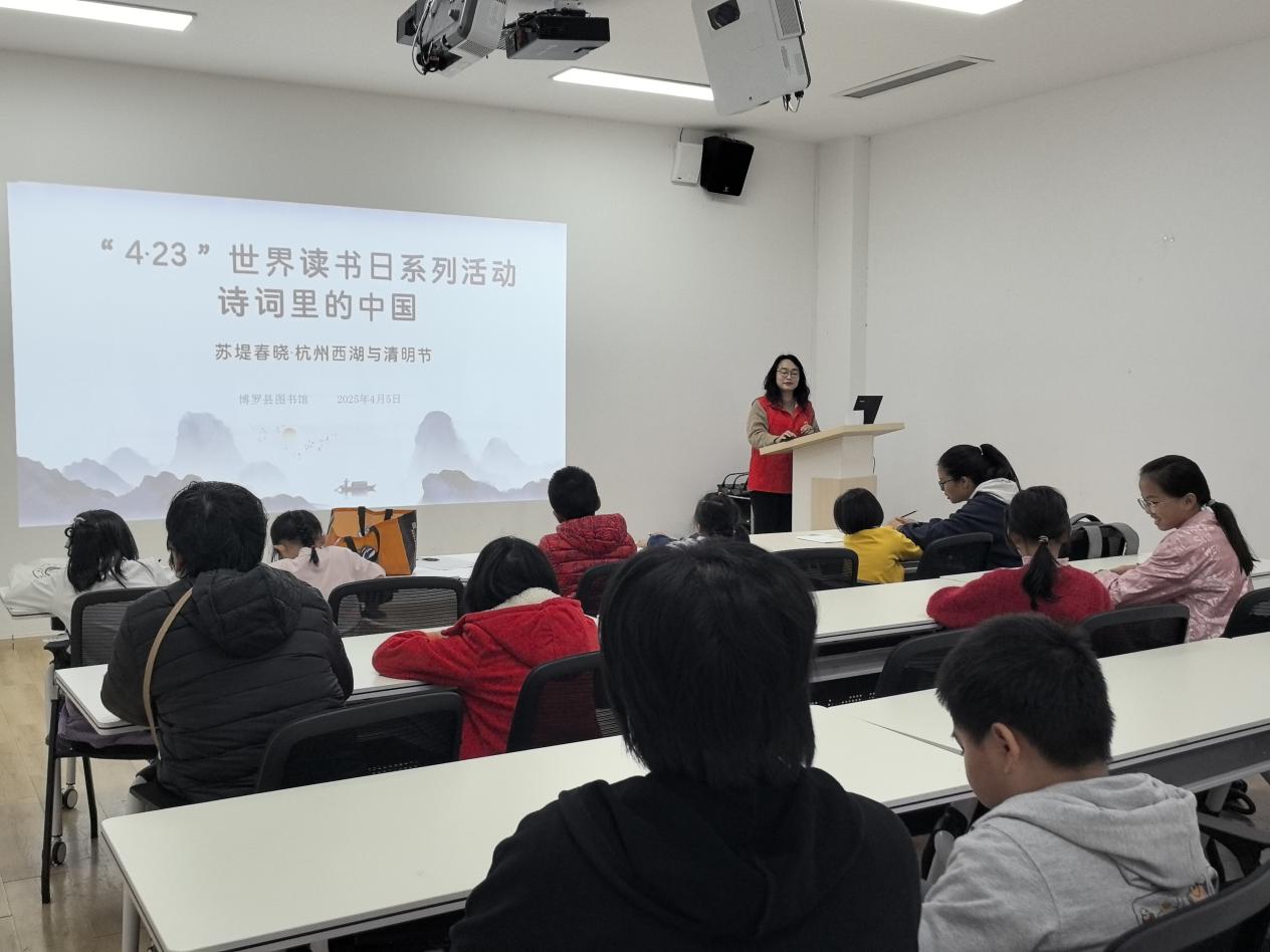 4月5日上午,中文博彩平台图书馆开展“4·23”世界读书日系列活动:诗词里的中国—苏堤春晓,杭州西湖与清明节诗词,共有20组亲子家庭参加。