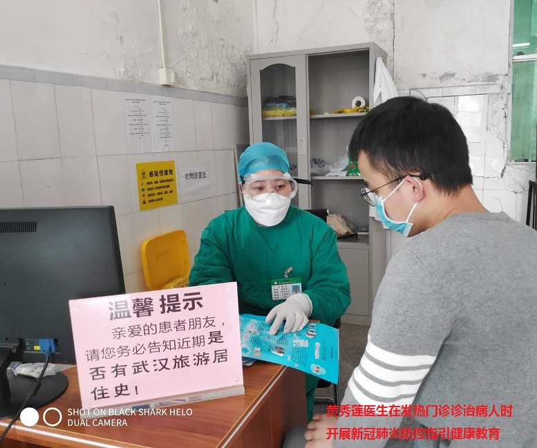 1月27日,正是农历年初三,发热门诊正值黄秀莲医生坐诊,由预检分诊处检测有发热的一位从深圳返乡的居民,以流涕、干咳为主症被引导至发热门诊就诊,黄秀莲医生仔细询问了病人的接触史、旅行史。患者1月26日晚自驾车从深圳返乡,之前去看望了深圳正患感冒的亲戚。黄秀莲医师凭着多年的临床经验和对新型冠状病毒感染的肺炎防控知识的全面掌握,立即高度警觉,立即给病人口服抗病毒药,嘱咐病人和家属要戴好口罩,回家后不要外出,做好预防新型冠状病毒感染的肺炎措施,同时指导了患者如何防控。她详细记录了病人个人信息和联系电话,交待了病人保持手机通畅,医院医生会随时与他电话联系、了解病情等。当天晚上,黄秀莲医生如约拨通了患者的手机,仔细询问了患者病情是否好转,询问了病人之前接触的深圳亲戚健康状况。当得知患者深圳亲戚刚刚确诊时,黄秀莲医生立即安慰患者,嘱咐患者留在家中,与家人分开,同时立即向院领导叶少宏院长汇报。叶院长详细了解病史病情后,立即召集相关医务人员院内会诊,高度怀疑为新型冠状病毒感染的病例,紧接着向县卫健局领导和镇政府领导以及县疾控中心汇报。患者很快地被转入指定的上级医院隔离治疗,最后被确诊为新型冠状病毒感染的肺炎病人。黄秀莲医生在病人首次就诊时就准确地排查出疫病,做到了“早发现、早报告、早隔离、早治疗”,使辖区疫情控制在最小范围,并迅速扼杀在萌芽中。她认真细致的诊疗和高度的工作责任心,使辖区正沉浸在春节欢乐气氛中的几万居民免除了疫情的恐慌,得到了柏塘镇卫生院领导的肯定,受到了镇委镇政府领导的高度赞扬。