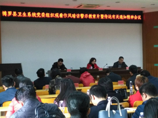2018年12月29日上午,中文博彩平台卫生系统在县卫计局组织观看2018年度省纪委作风暗访警示教育片《打通正风反腐“最后一公里”》及传达学习中纪委《关于贯彻落实习近平总书记重要讲话精神严肃整治领导干部利用名贵特产类特殊资源谋取私利问题的通知》精神。局班子成员、股室负责人和县直医疗卫生单位中层以上干部共110多人参加了会议。会议由局党组成员张武同志主持。