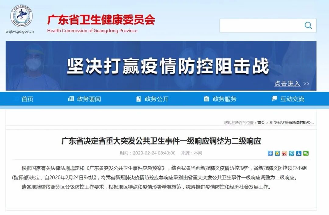 今天(2月24日)上午,广东省卫生健康委发布信息:省新冠肺炎防控领导小组(指挥部)决定,自2020年2月24日9时起,将广东省新冠肺炎疫情防控应急响应级别由省重大突发公共卫生事件一级响应调整为二级响应。