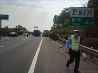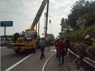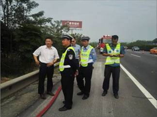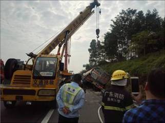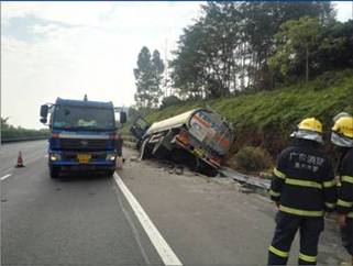 11月10日早上7点40,县接报在广惠高速长龙段(广州往惠州方向离沙河服务区2公里处靠应急车道)发生一起槽罐车侧翻道路交通事故。据初步调查:事故发生于11月10日早6时50分左右,广州穗兴公司的一辆槽罐车(粤AN5327,核载24吨),实际装载三甲苯溶剂13吨,发生一起槽罐车侧翻道路交通事故。因事故车辆发生于应急车道侧翻,本次事故司机和押运员(均为茂名人)无受伤,无人员死亡,高速交通除倒罐时封堵30分钟左右外基本顺畅。 县消防大队、安全监管局、环保局等部门有关人员、车辆、装备先后到达事故现场开展应急救援工作,并调动广州穗兴公司转运车辆(粤AN3797)、两辆一吊车、一辆拖车到达事故现场开展救援工作。市安全监管局刘建斌副局长、市交警支队有关领导到达现场指挥救援。现场指挥部确定了事故处置的基本方案。9时10分开始倒罐,9时40分基本倒罐完成,因车载泵功率问题还有剩余2吨未抽取,先两辆吊车将事故车辆吊装扶正,于9时50分完成扶正事故车辆后,再将剩余2吨三甲苯用泵转至转运车辆。于10时10分全部完成,事故现场于10时20分全部处置完成,道路恢复畅通。