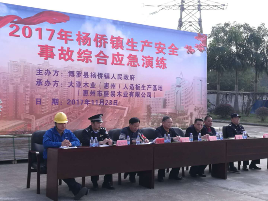 本次演练活动由杨侨镇政府主办,惠州市盛易木业有限公司承办,由杨侨镇党委委员、副镇长陈林华同志担任总指挥,分管安全生产工作的领导担任现场指挥。参加本次演练活动观摩的领导和嘉宾有:县安监局纪监员、党组成员曾玉生及县安全生产应急指中心负责人,杨侨镇党委委员、副镇长陈林华、镇党委委员、派出所所长钟慧明,杨侨镇部分企业代表等共计100余人。