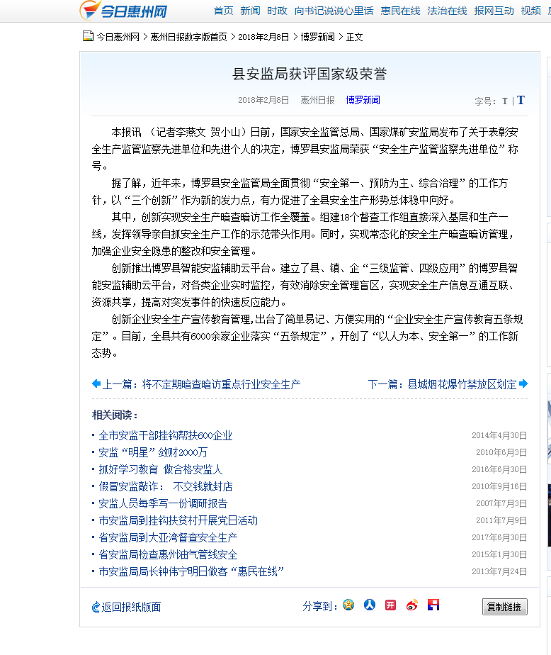 县安全监管局获评国家级荣誉喜登惠州日报