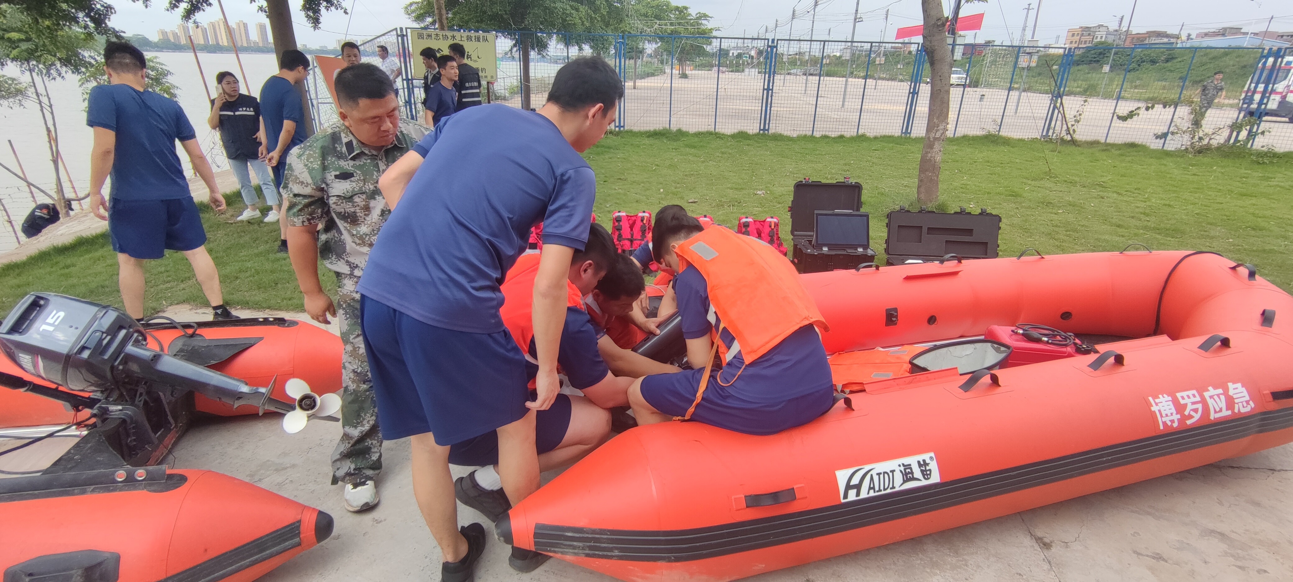 各应急小组按照应急预案展开行动,分工有序,迅速将橡皮艇(冲锋舟)安装、布置完毕。