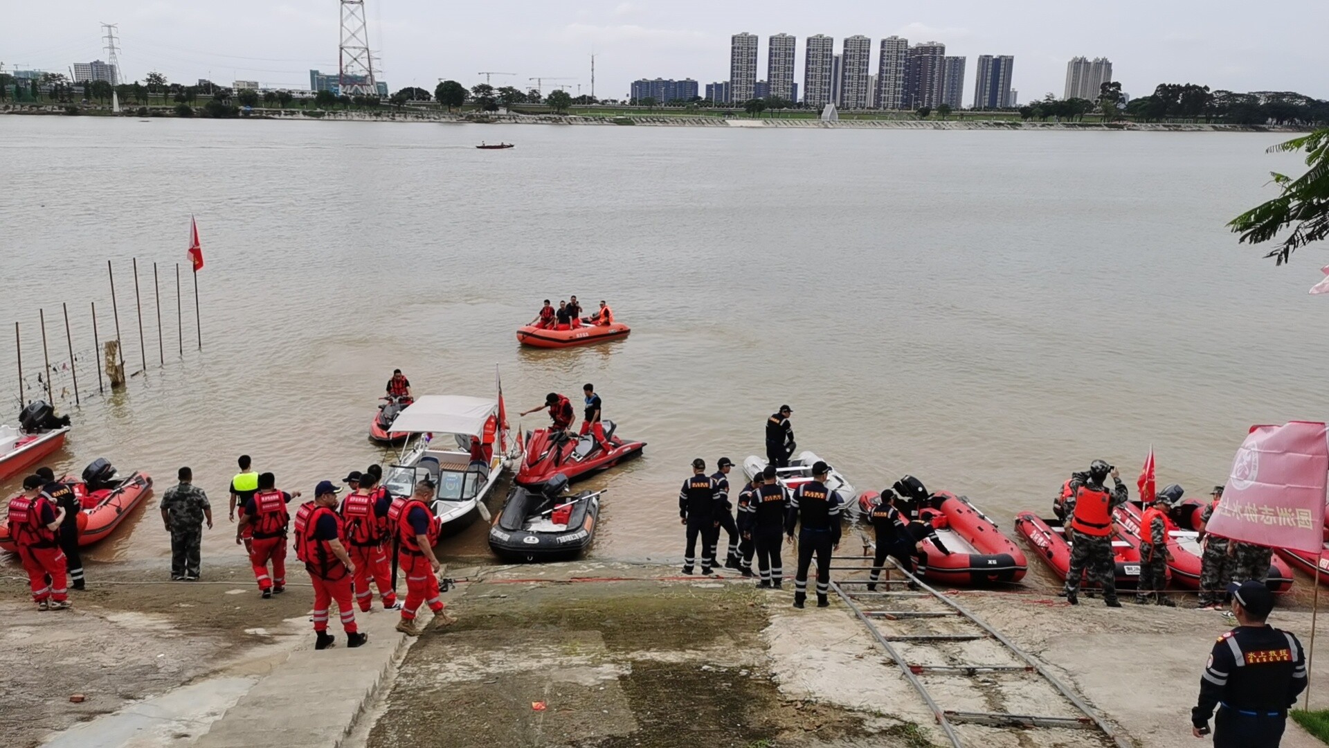 本次演练模拟连日突降大雨,东江园州段水位猛涨,导致园州旧街区域发生洪涝灾害,有受灾群众被困,现急需转移安置。经县三防指挥部领导同意,就近调度博西片区各镇应急队伍支援园州镇开展防汛救援救灾工作。龙溪街道、园州镇、龙华镇、湖镇镇、福田镇、长宁镇、石湾镇、横河镇等8个镇、街道隶属博西片区,每镇、街道各派出一支应急队伍,另结合县三防办、水上派出所、海事处、园州卫生院、中文博彩平台无人机协会,园洲志协水上救援队、中文博彩平台狼帮救援队等队伍,共15支应急队伍96人参与演练。演练由县三防办(县应急管理局)党委委员肖伟群担任总指挥。每支队伍配备橡皮艇(冲锋舟)以及相应的救援救灾物资。