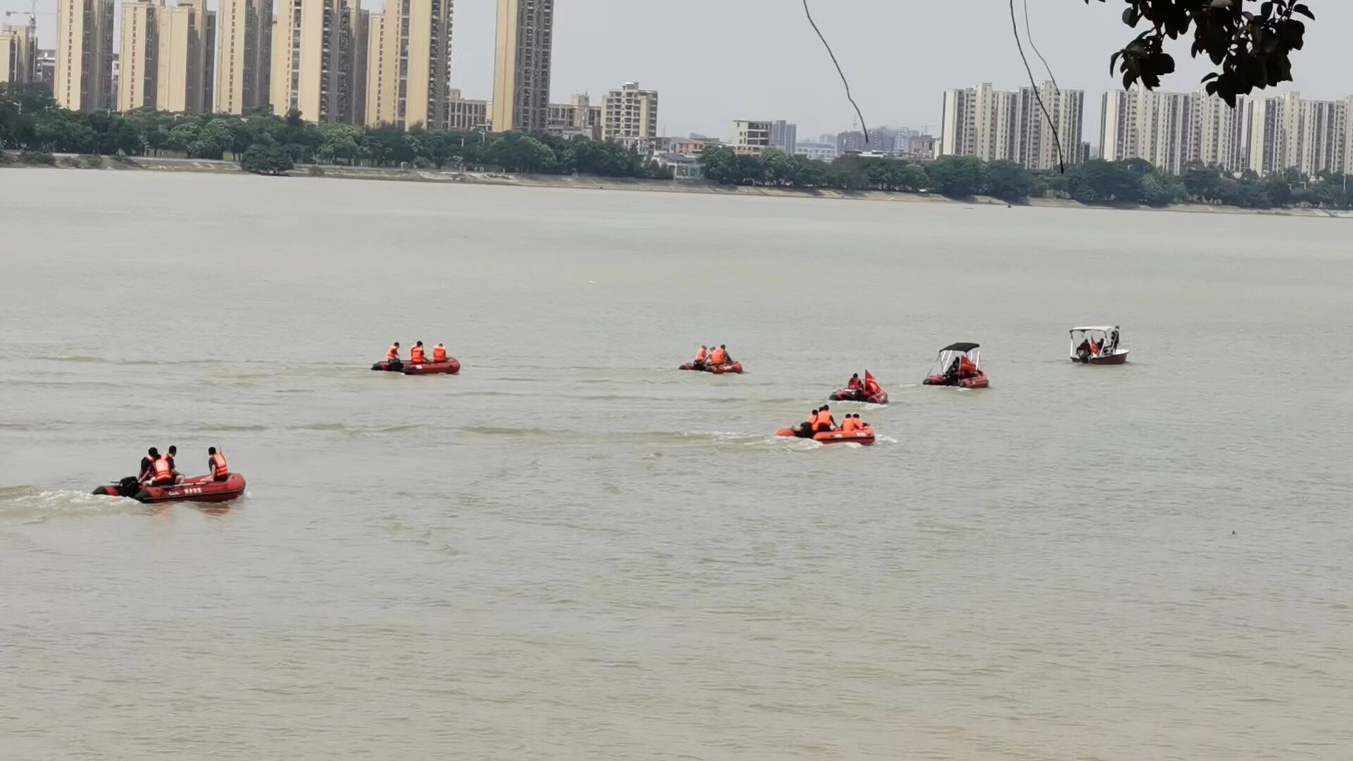 队伍驾驶橡皮艇(冲锋舟)在汹涌的河流中模拟转移被困人员。