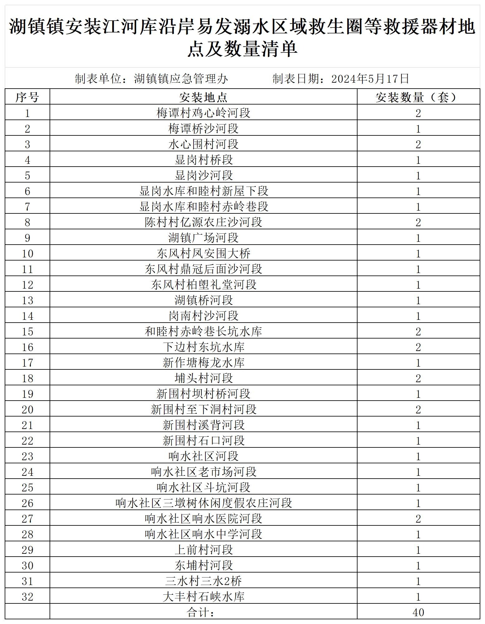 根据上级防溺水事件安全防范工作部署,溺水事故进入高发期,为进一步筑牢生命安全防线,完善应急配套设施,第二批救生圈等救援器材于2024年4月22日起配送至各镇街和公益救援队进行投放并安装。截止于2024年5月21日各镇街和公益救援队基本完成救生圈等器材安装并持续维护工作。