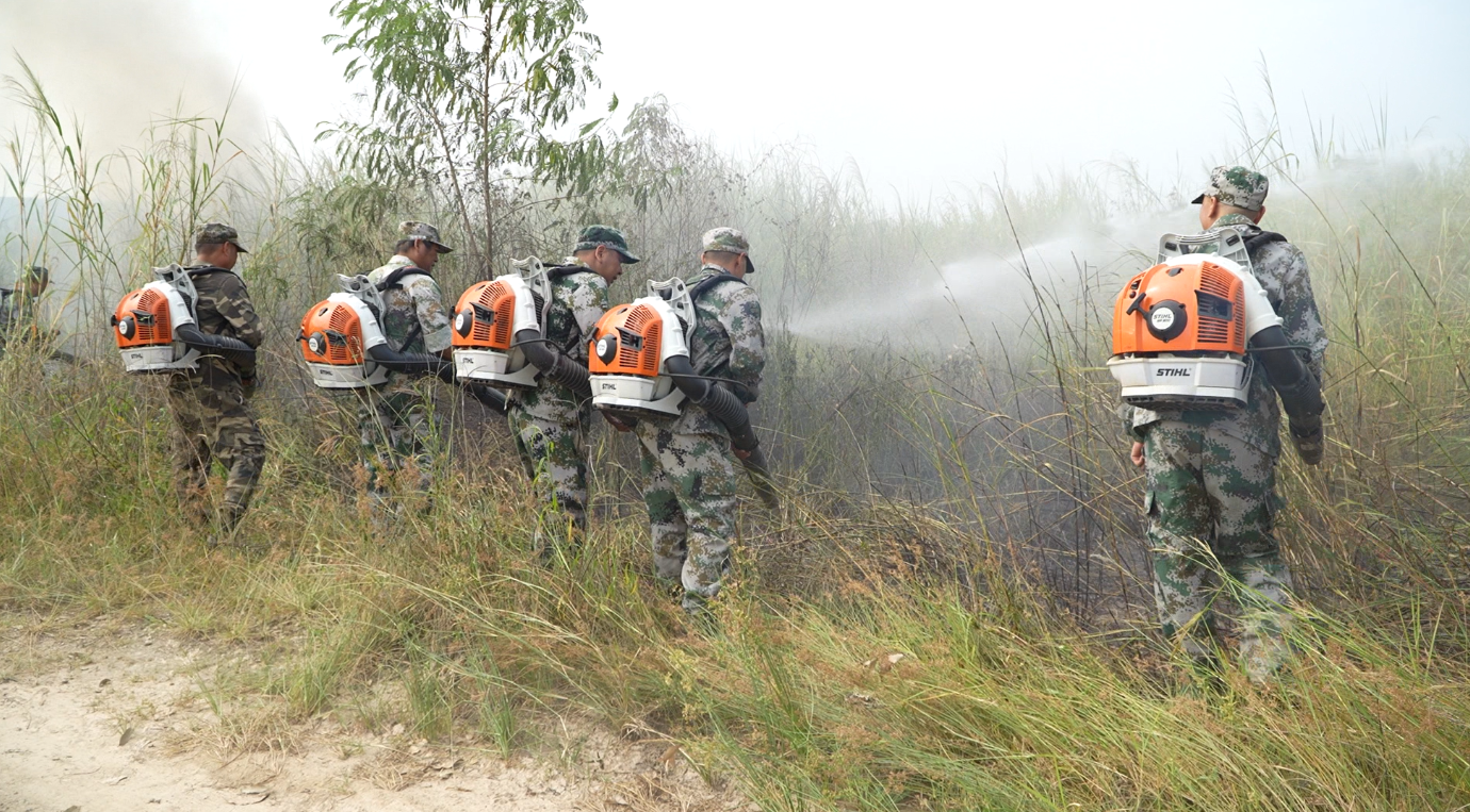 “前方出现火情,请各方队紧急赶赴现场,消除火警火情,确保安全……”随着现场指挥一声令下,森林防灭火工作人员火速集结,奔赴模拟火场展开扑救。队员们运用镰刀开路,风力灭火机控制火线,水枪攻灭火头等措施扑灭明火,用安全科学的方法控制火情,防止火势进一步蔓延。
