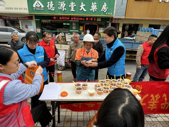 县医保局志愿者现场为户外劳动者端上现煮八宝粥,并派发医保政策宣传资料,通过现场讲解2025年城乡居民医疗参保缴费流程和政策,进行医保政策宣传。