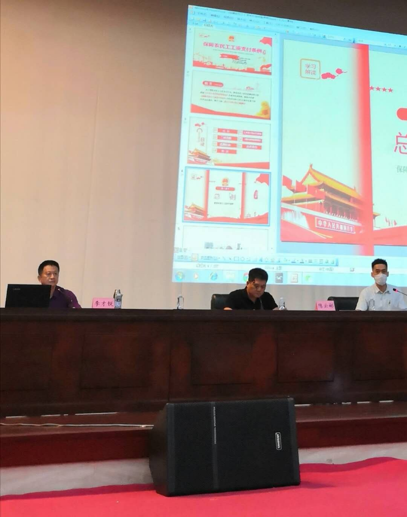 会议通过PPT演示,采取图文并茂、以案释法的形式,围绕《条例》的立法背景、立法目的和立法原则进行介绍,并对《条例》的特点、创新点等方面进行了讲解,详细解读了《条例》对农民工工资支付形式与周期、工资清偿、法律责任的规定等重要条款,让各参会人员对《条例》有了更深刻的认识。