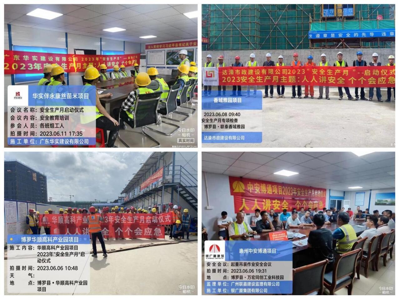 为深入学习贯彻习近平总书记关于安全生产重要论述精神,根据《2023年广东省住建领域“安全生产月”和“安全生产南粤行”活动方案》《惠州市住建领域2023年“安全生产月”和“安全生产南粤行”活动方案》《中文博彩平台住建领域2023年“安全生产月”和“安全生产南粤行”活动方案》文件精神及工作部署,坚持安全第一、预防为主,坚持树牢安全红线意识,广泛开展安全宣传“五进”活动,常态化推进安全宣传教育,大力营造防范化解重大安全风险的浓厚氛围,2023年6月,我县各房屋市政工程在建项目响应“安全生产月”工作部署组织开展培训、演练等系列活动。