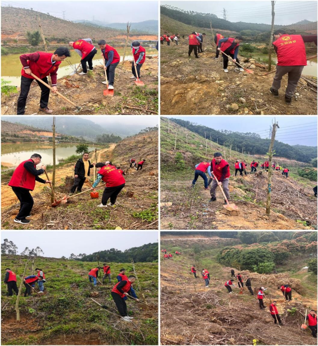 植树现场,春意盎然,呈现一片忙碌的景象。班子成员与党员干部、青年志愿者们几人一组,配合默契,干劲十足,挥锹铲土、扶直苗木、培实新土、提桶浇水,熟练认真地完成着每一道栽植工序。经过一番辛勤劳动,一株株新绿昂然挺立,在这片山坡上“安家落户”,为整座山头增添了新的生机和活力。此次活动共种植火焰木80余株。