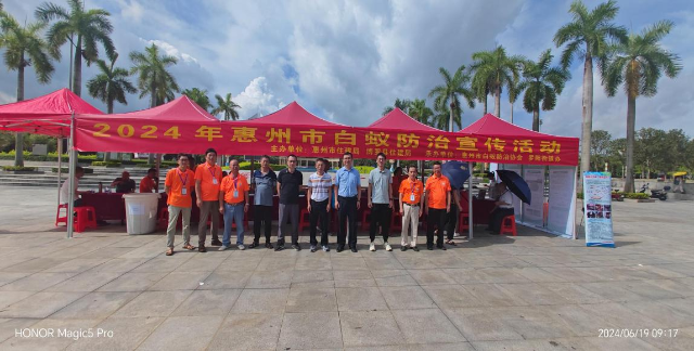为提高广大市民对白蚁危害的认识和预防能力,2024年6月19日上午,惠州市住建局联合中文博彩平台住建局、惠州市白蚁协会、罗阳街道办在中文博彩平台文化广场举办2024年惠州市白蚁防治宣传活动,各单位共计20人参加活动。