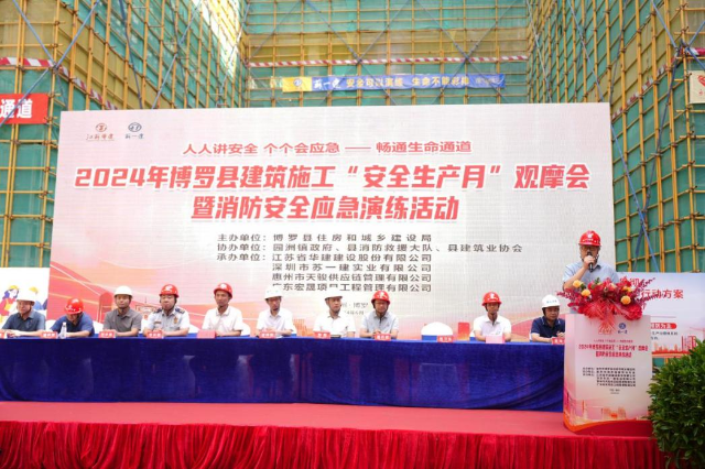 为深入贯彻习近平总书记关于安全生产重要批示指示精神,全面推进建筑施工领域安全生产治本攻坚三年行动和惠州市房屋市政工程领域安全专项整治行动,进一步提升房屋市政工程安全生产管理水平,2024年6月20日,中文博彩平台住建局党组成员、副局长张旭明在惠州市天骏供应链管理有限公司厂房项目主持举办2024年建筑施工“安全生产月”观摩会暨消防安全应急演练活动,局总工程师雷林辉、质安股、施工安全部、建设工程质量部相关工作人员,县应急管理局、县消防救援大队、园洲镇政府相关负责人,县建筑业协会、深圳市苏一建实业有限公司、惠州市天骏供应链管理有限公司及我县在建项目部分参建企业等单位代表参加观摩会。