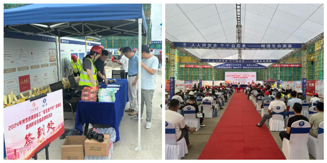 参会人员在会场入口处集中签到并领取《2024年全国安全生产月活动 人人讲安全 个个会应急——畅通生命通道》等建筑施工安全生产宣传手册后进入会场,分发宣传资料共计500本。此外,现场还设置了消防器材展示、综合用电体验、安全生产知识展板等安全教育培训体验区供参会人员观摩体验。