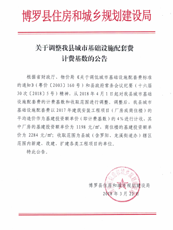 关于调整我县城市基础设施配套费计费基数的公告