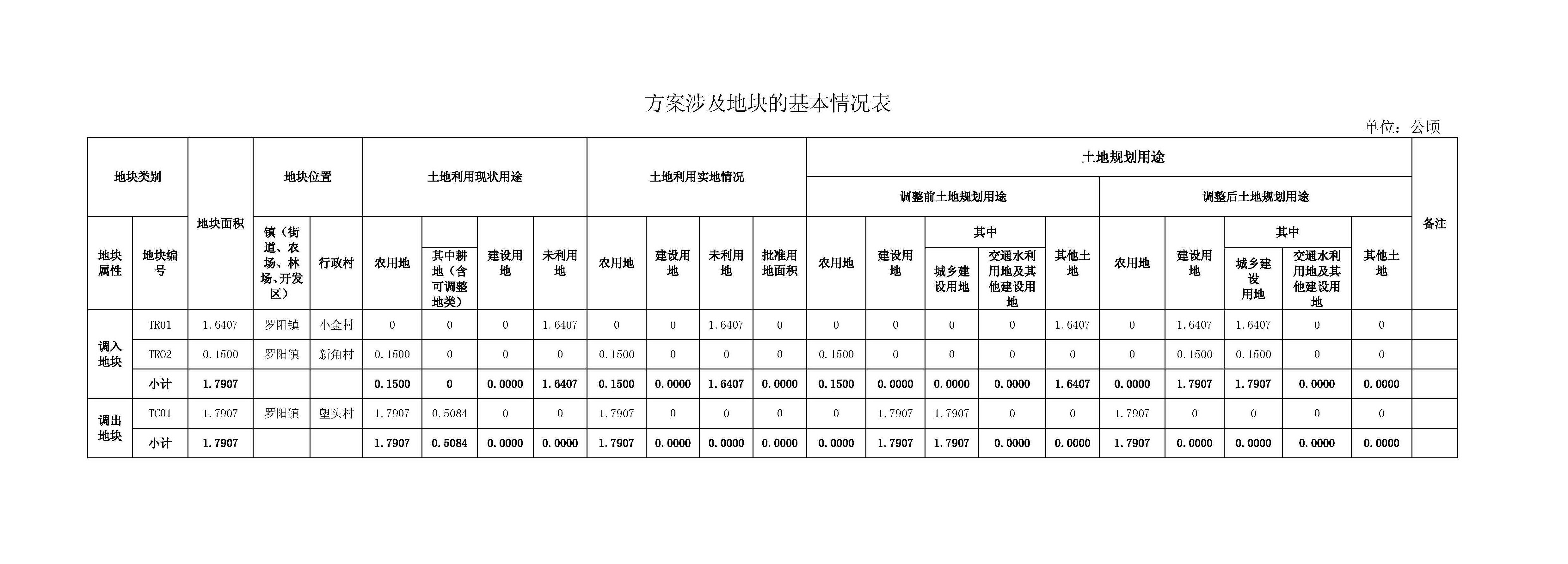 《方案》拟在罗阳镇小金村和新角村调入城乡建设用地规模1.7907公顷;在塱头村调出同等面积城乡建设用地规模(详见附件1)。