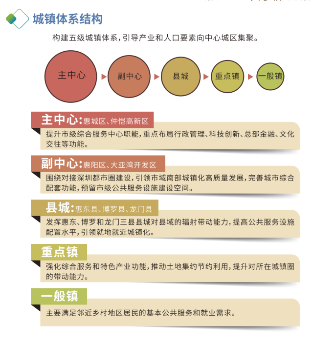 同时,惠州还将构建起“主中心-副中心-县城-重点镇-一般镇”的五级城镇体系引导产业和人口要素向中心城区聚集。