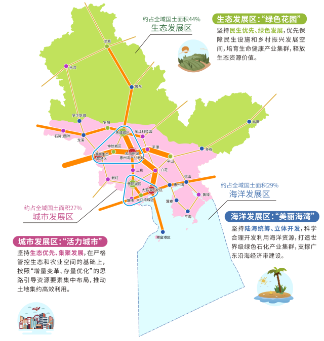 城市发展区则定位为“活力城市”,占全域国土面积27%,惠城、仲恺、惠阳和大亚湾四个市区组团为主体。将坚持生态优先、集聚发展,按照“增量变革、存量优化”思路引导资源要素集中布局,推动土地集约高效利用。