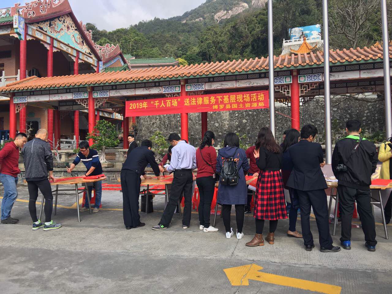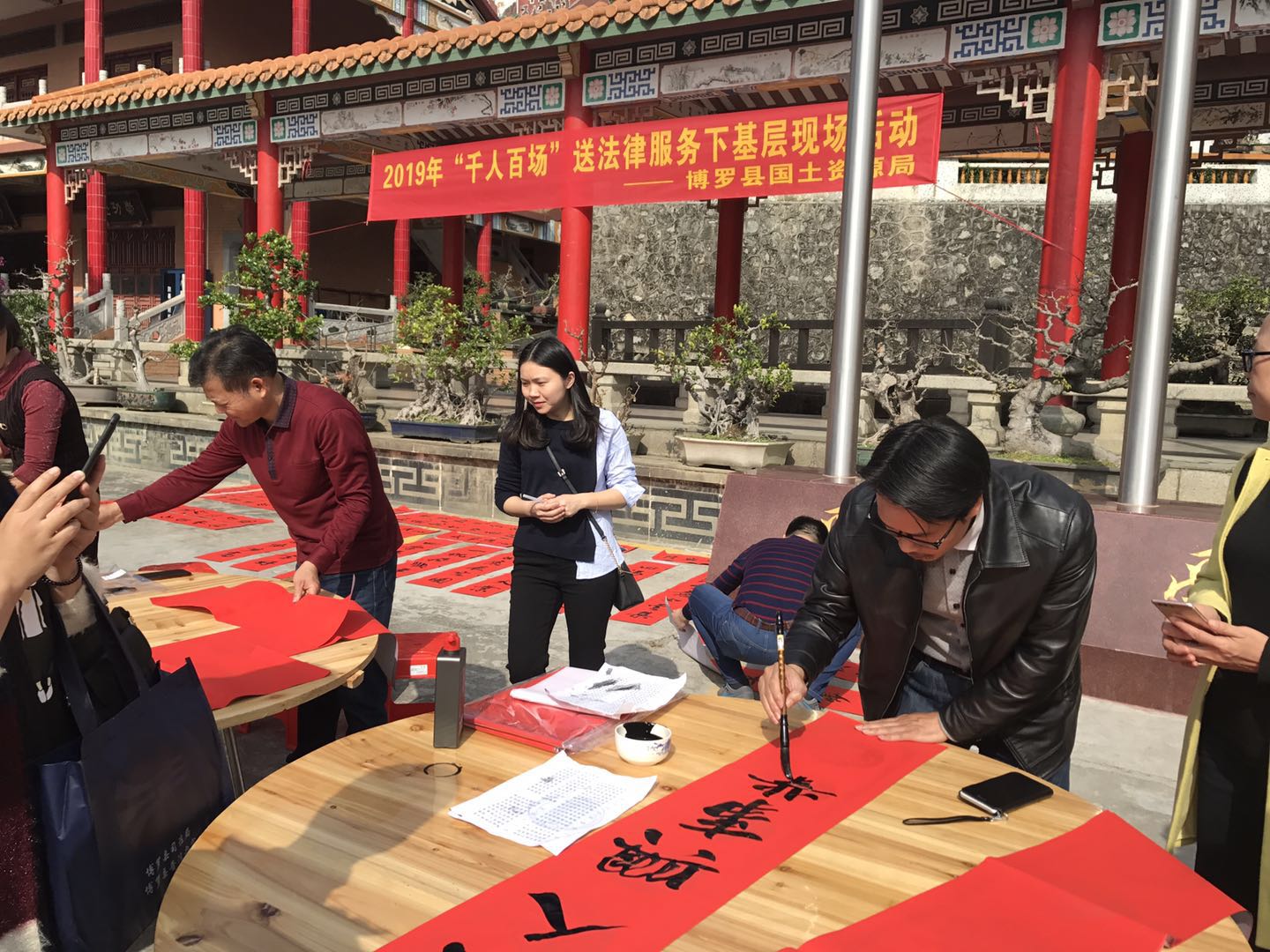 为弘扬社会主义核心价值观,县国土资源局携手法制部门、罗浮山管委会与数位书法家,举办赠春联公益活动吸人人群进行的普法宣传,老师们挥毫写联,居民们学法用法。