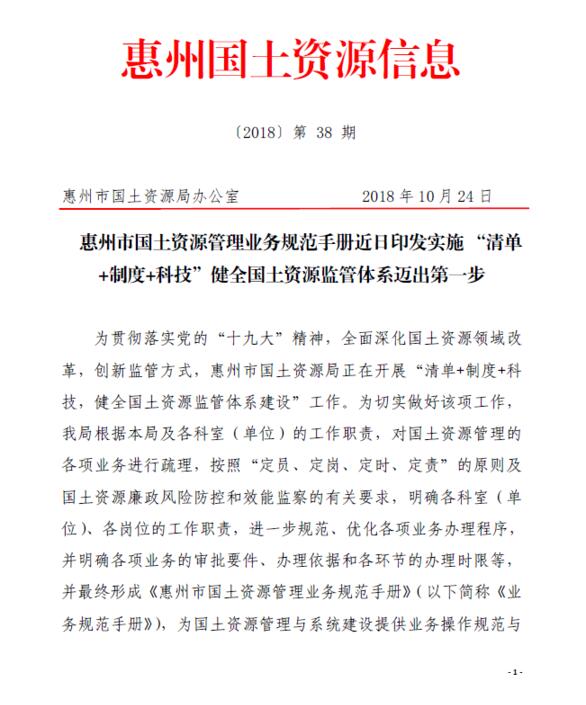 惠州市国土资源管理业务规范手册近日印发实施 “清单+制度+科技”健全国土资源监管体系迈出第一步