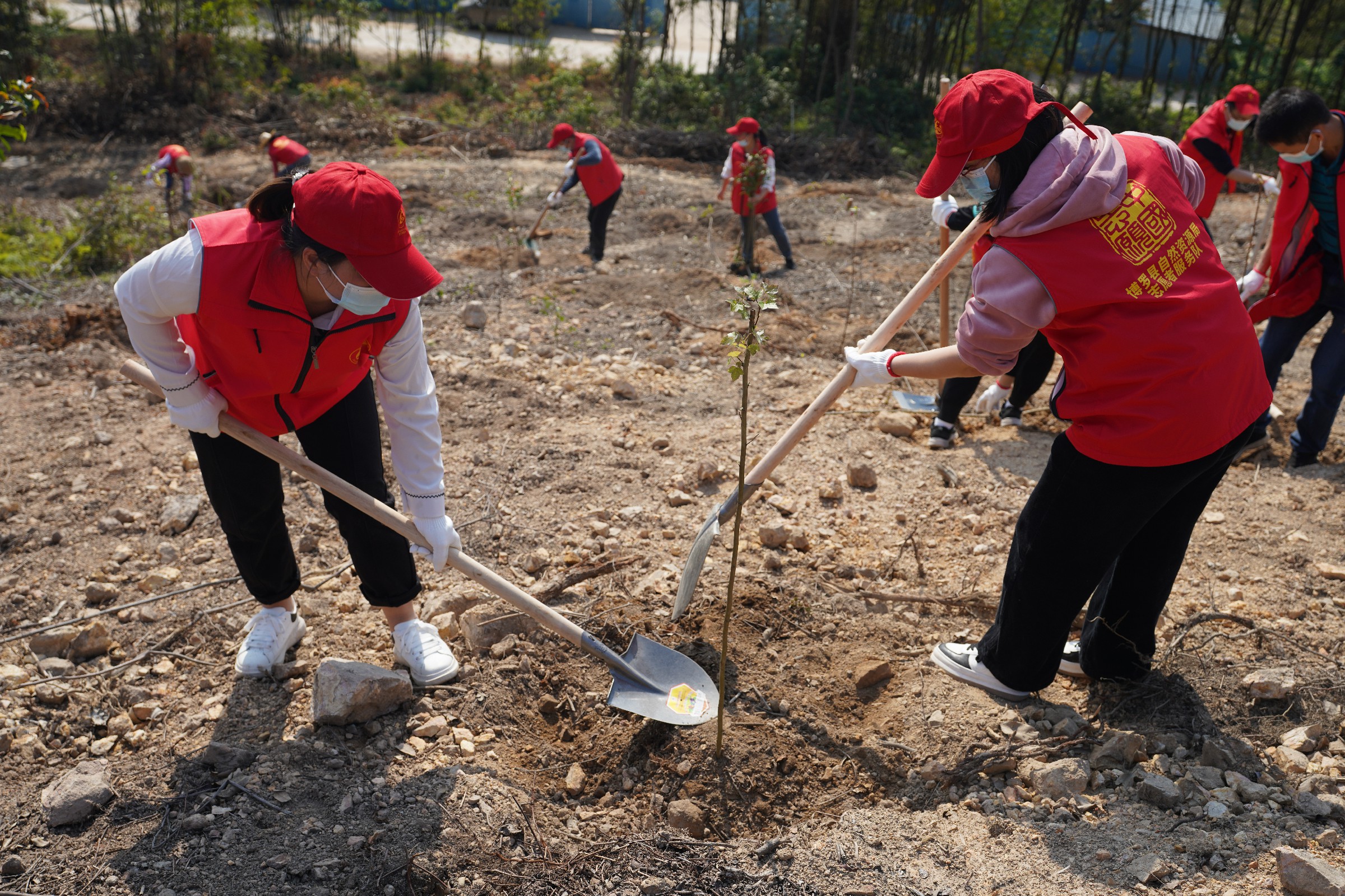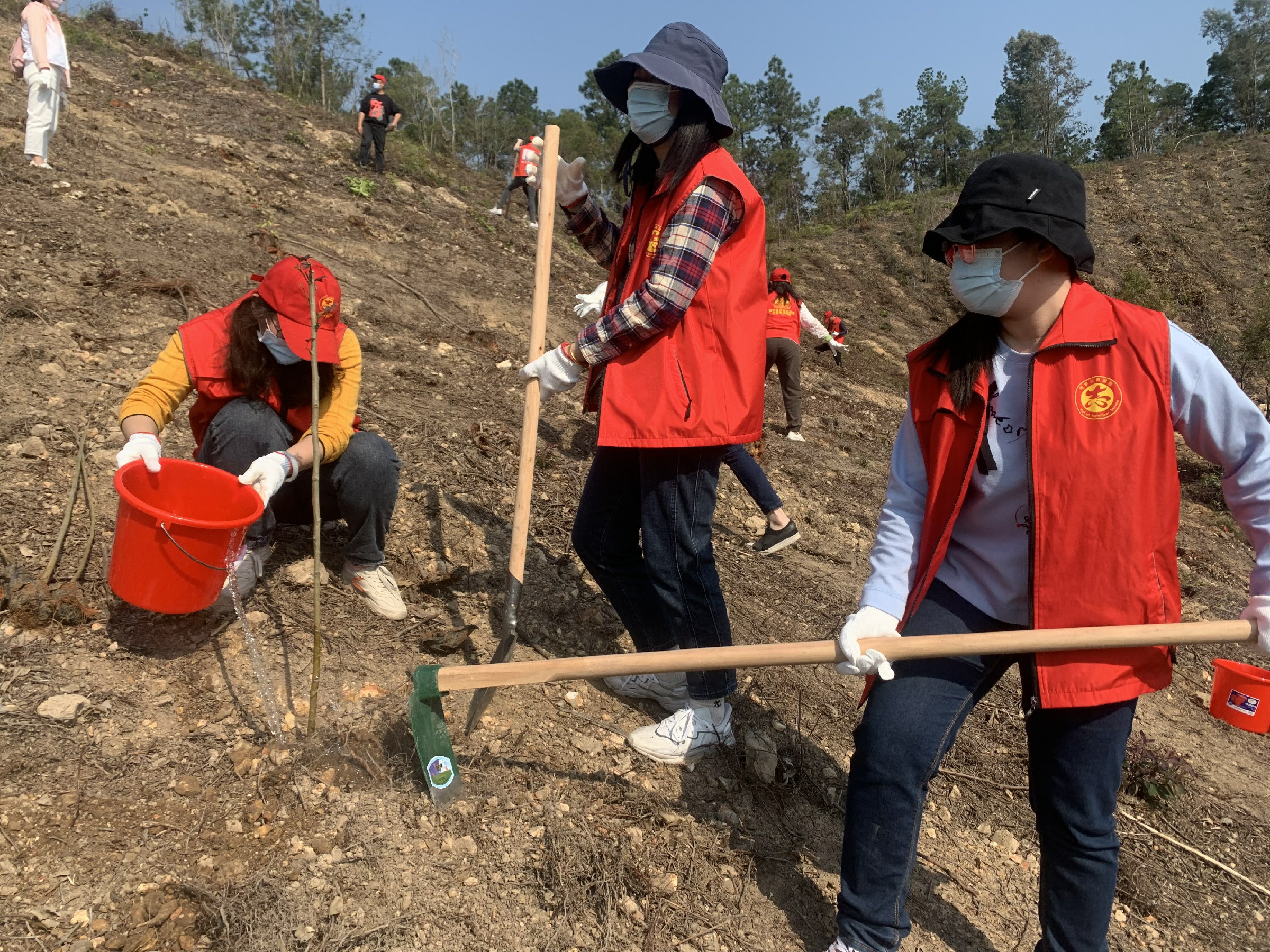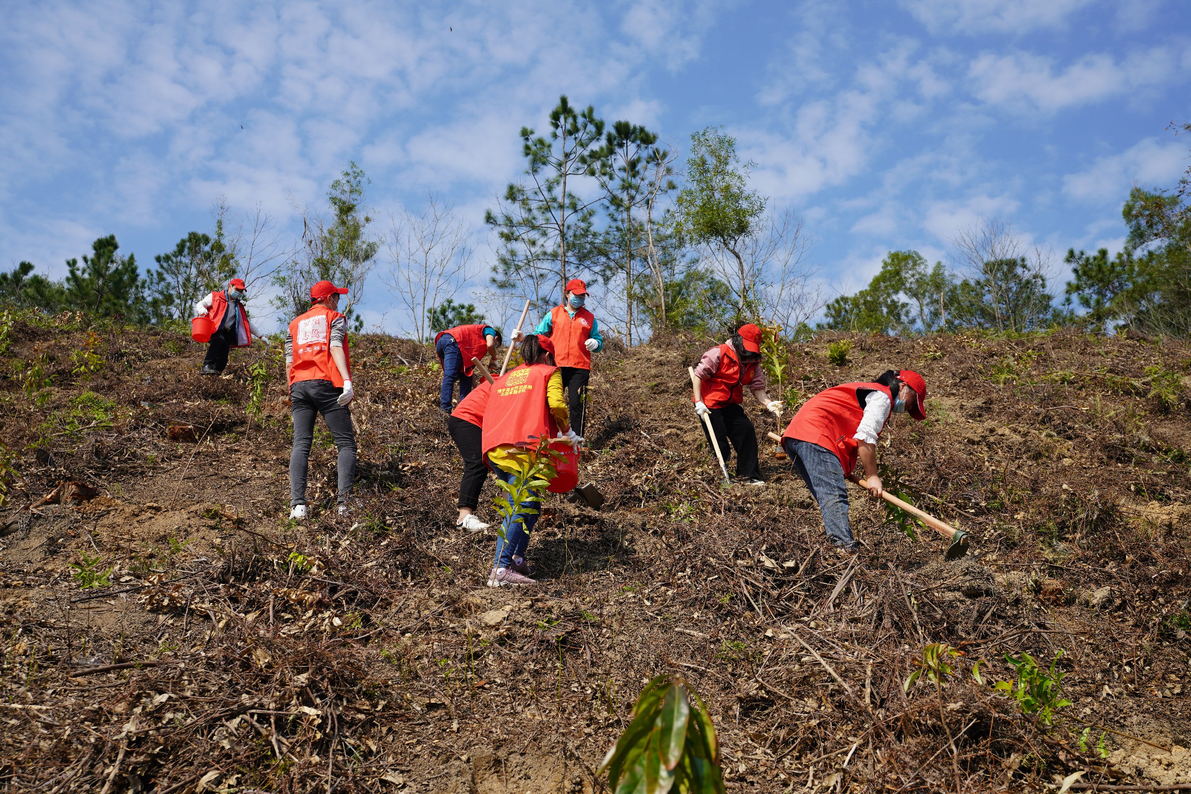 上午10时,身着红马褂的志愿者植树热情高涨、干劲十足,他们挥锹铲土、扶正树苗、堆土围堰、培土浇水……经过一个多小时的辛勤劳作,共种植树苗100余株。一株株小树苗立满小山坡,为马山增添了勃勃生机。