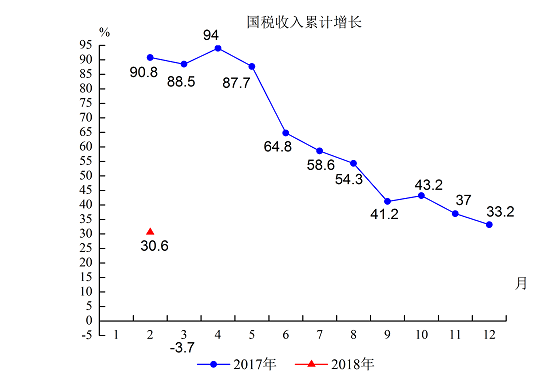 (五)税收收入加快增长。1-2月,全县税收收入实现“开门红”,国税、地税双双实现30%以上的高速增长。国税收入完成9.13亿元,增长30.6%;地税收入完成4.4亿元,增长34.6%。两税收入合计完成13.53亿元,增长31.9%,增幅比上年同期提高4.8个百分点。