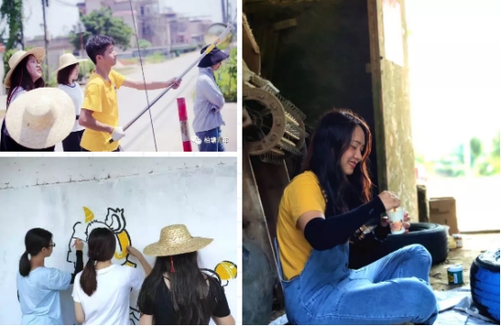 从8.5-8.20正式完工,经历了15天,这些天里,我们经历了各种各样的天气、遇到了很多困难,有时候前一天刚画好的粉笔草稿,还没来得及上色,夜里一场大雨就把墙壁冲刷糊了,也有过天黑了还不肯走,小伙伴们打着手机的光一起照着的,有过台风天,天天下雨,掐着指头盼着雨停,有过艳阳天,虽然晒的皮肤成了古铜色,但是心想还好可以开工,最开心就是阴天啦!可惜这样的日子太少啦……有汗水、辛苦、也有欢笑,重要的是,我们在一起,完成了这件有意义的事情,过去的一切都成了美好的回忆,能通过自己的双手一起努力把家乡改造的越来越美丽,成就感满满。