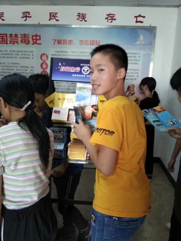 在活动现场给七年级新生分发了禁毒知识宣传资料。在场的学生阅读禁毒知识宣传资料。在活动现在七年级新生观看禁毒宣传教育视频。