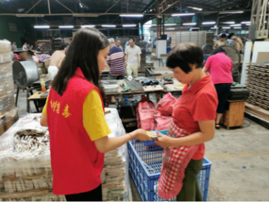 (图为禁毒社工为员工发放禁毒宣传手册)