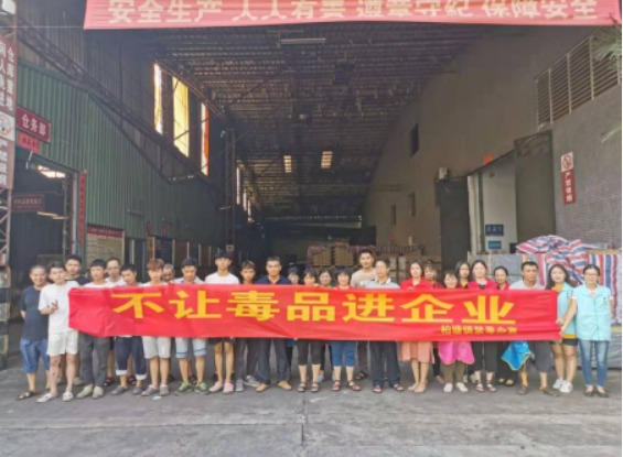 为进一步提高企业抵制毒品的意识和能力,2019年9月上旬,柏塘镇综治办专职副主任古国洪、禁毒办专职副主任邹东荣带领镇禁毒办社工、镇扫黑办工作人员在平安辖区稳乐运动器材有限公司开展了一场精彩的禁毒教育宣传活动。