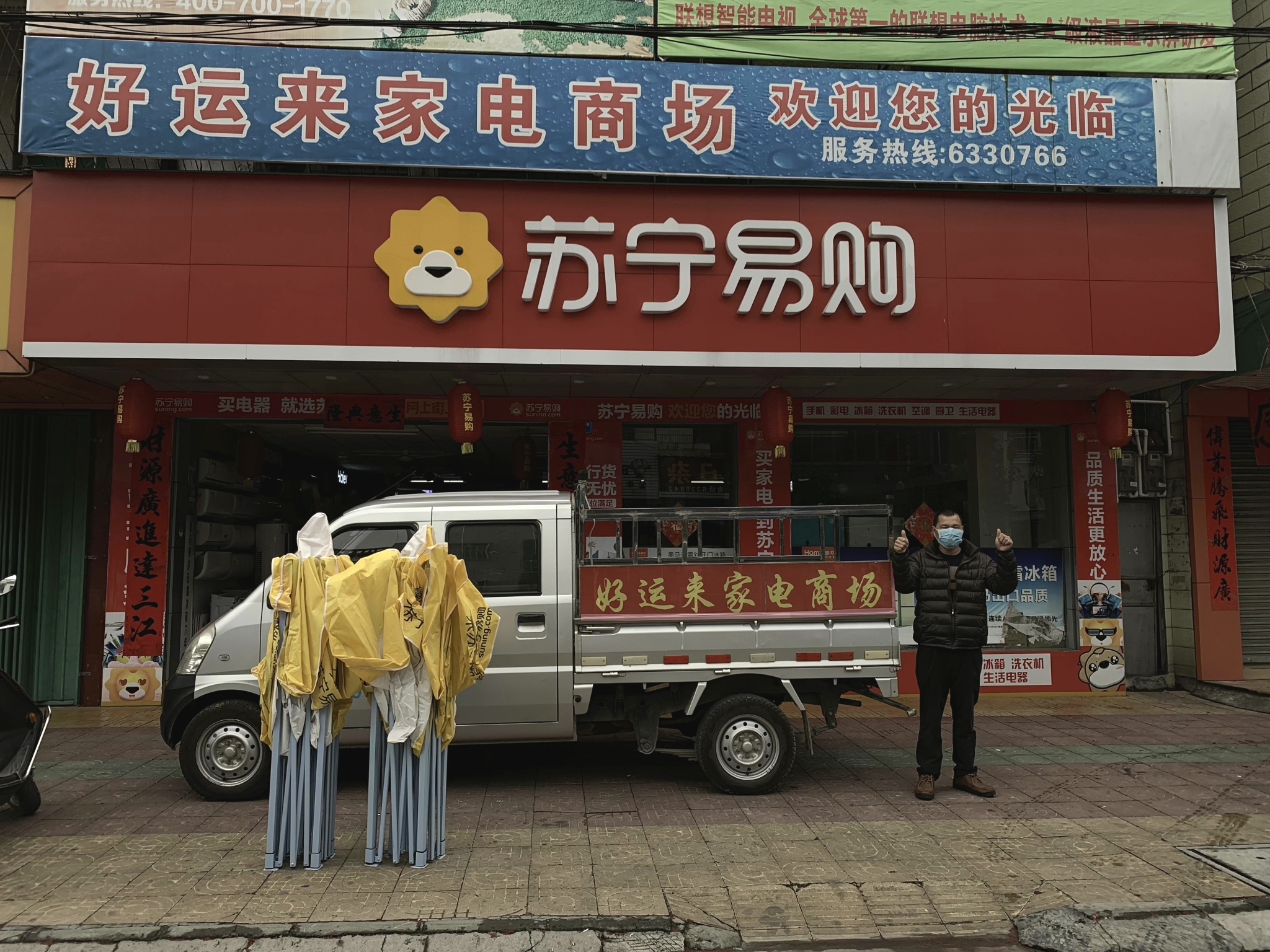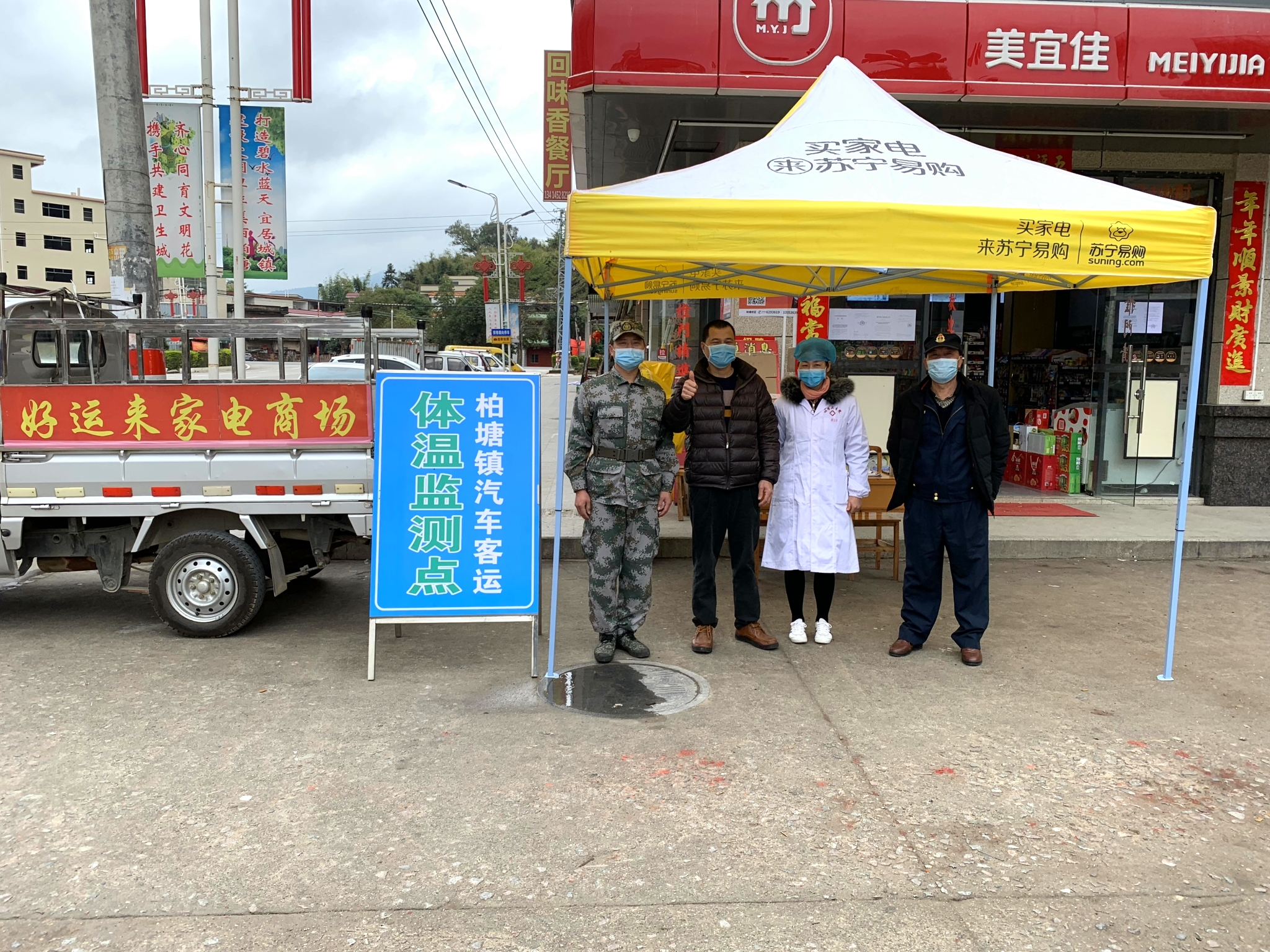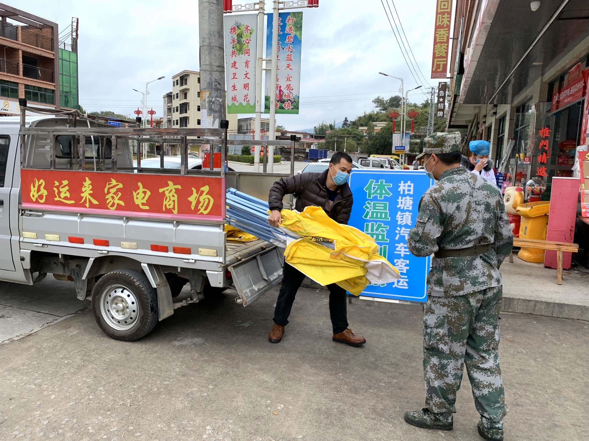 “一线工作人员太辛苦了,我们送个帐篷,只是想为防控疫情贡献自己一份力量”。好运来家电商场老板如是说道。据悉,柏塘镇好运来家电商场老板留意到近期天气为阴天多雨,他突然想起,市场设卡点没有躲雨帐篷,于是他连忙把自身商场目前仅有的1个帐篷送往市场设卡点。